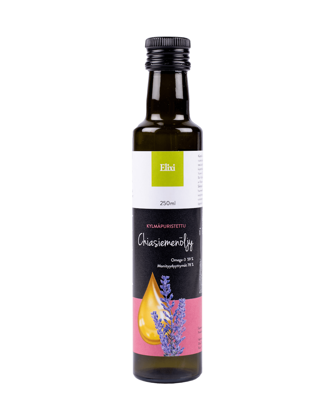 Kotimaassa tuotettu kylmäpuristettu Chiasiemenöljy sisältää runsaasti omega 3 -rasvahappoja. Chiasiemenrouhe puolestaan sisältää runsaasti kuitua ja soveltuu moneen käyttötarkoitukseen.