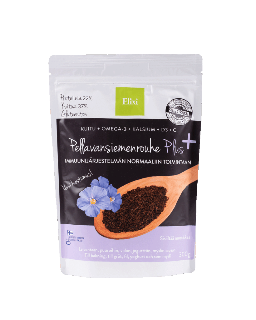 Nauti kuidun, kalsiumin, c- ja d-vitamiinien hyödyistä samalla ruokalusikallisella! Elixi Pellavansiemenrouhe Plus yhdistää tärkeät vitamiinit, pellavansiemenen kuidut sekä mustikkaisen maun.