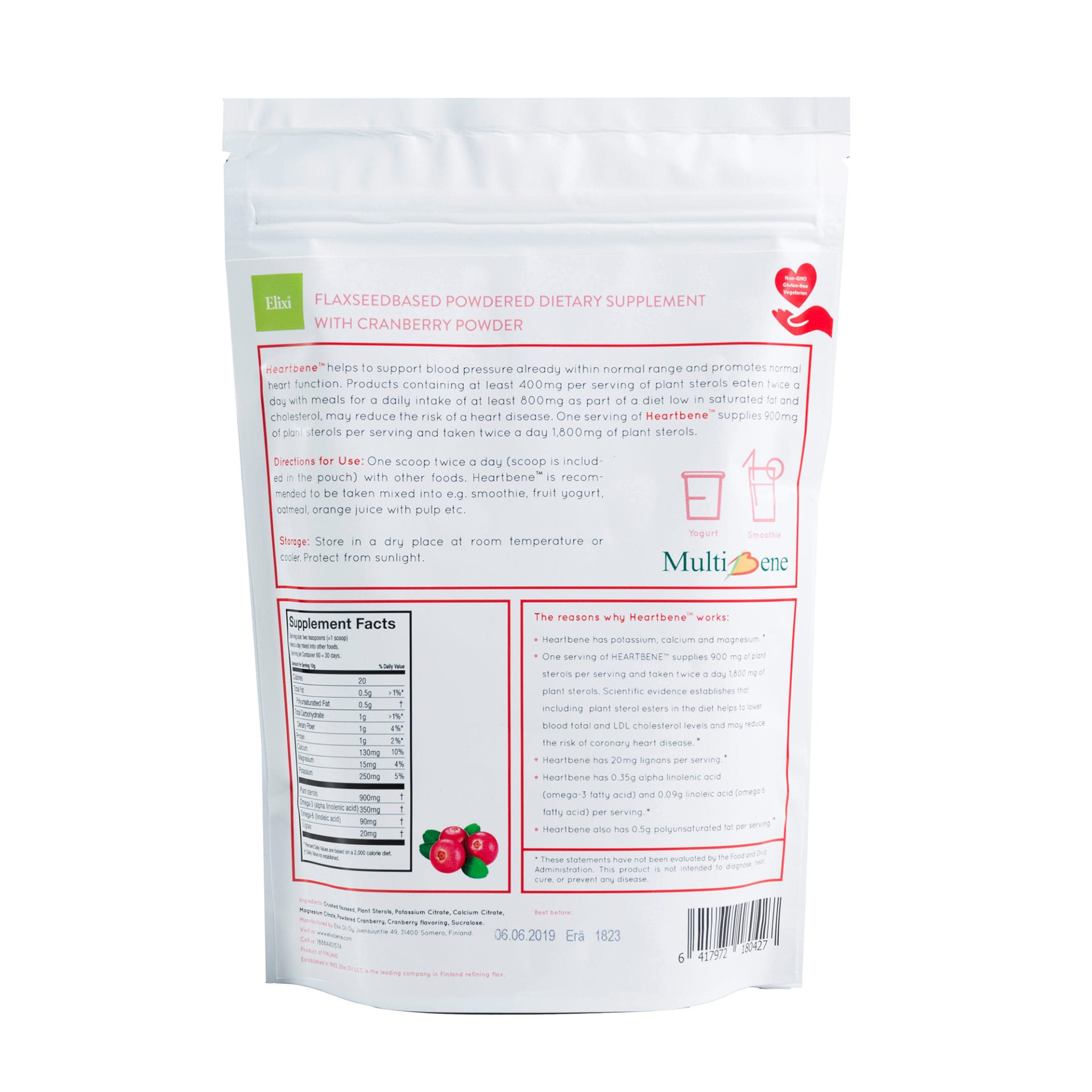 Elixi Heartbene is a patented mixture of Finnish crushed flaxseed, plant sterol and potassium and calcium salts. Elixi Heartbene helps the blood pressure to remain normal* and reduces the cholesterol level of the blood**. Elixi Heartbene is intended as a part of a varied diet. The product is gluten-free.