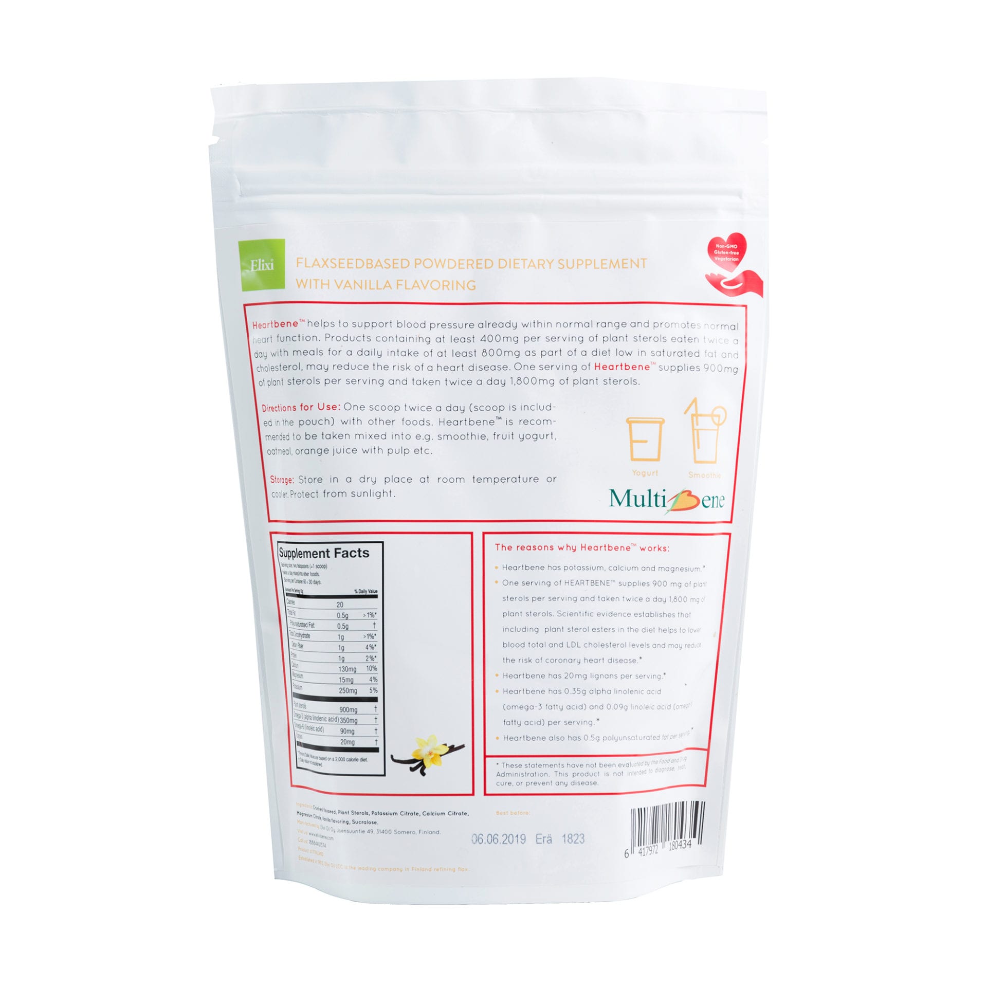 Elixi Heartbene is a patented mixture of Finnish crushed flaxseed, plant sterol, thiamine and potassium and calcium salts. Elixi Heartbene helps the blood pressure to remain normal* and reduces the cholesterol level of the blood**. Elixi Heartbene is intended as a part of a varied diet. The product is gluten-free.