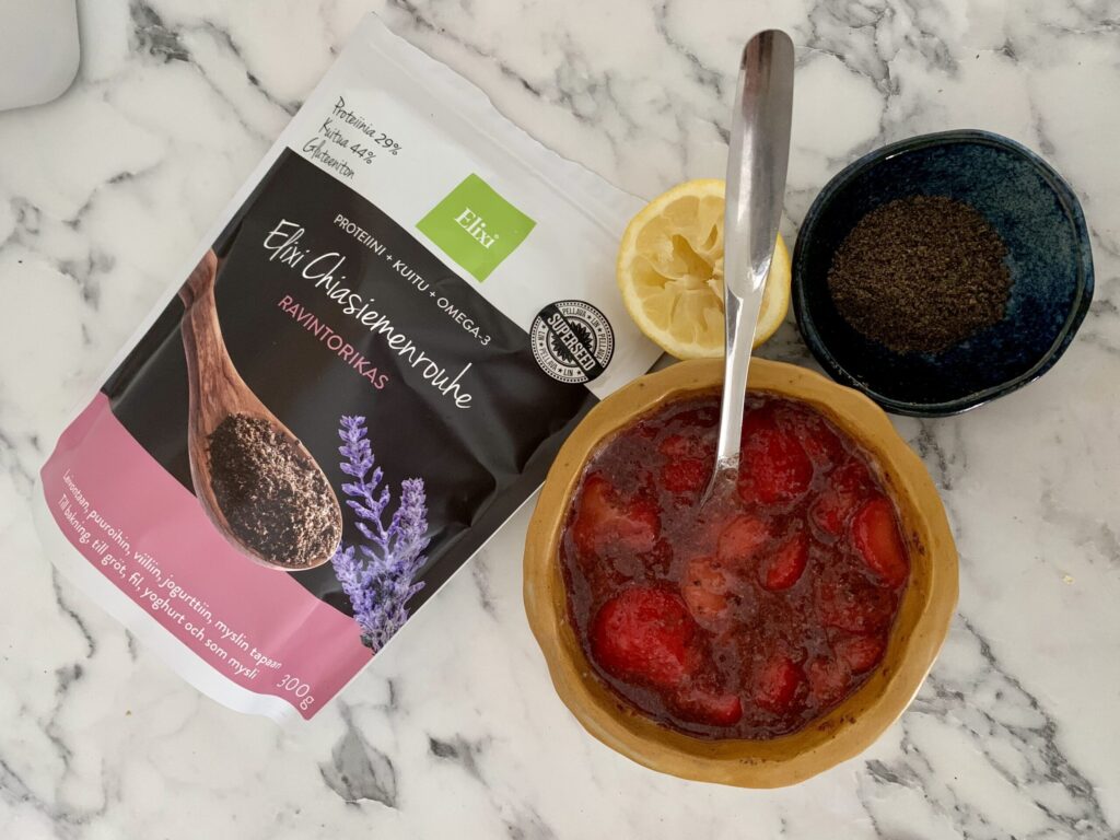 Tätä mansikkahilloa voi syödä huoletta aterialla kuin aterialla! Raikas chiahillo syntyy kirjaimellisesti käden käänteessä ilman kuumentamista tai hillosokeria, ja on kuitu- ja omega 3 -rikas.