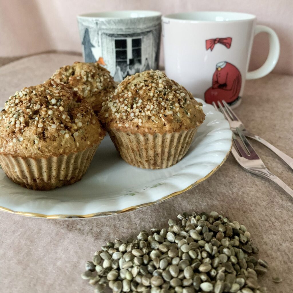Nämä omenanmakuiset hamppumuffinsit tehdään käden käänteessä kaapista löytyvistä aineksista ja reseptiä voi soveltaa lisäämällä taikinaan vaikkapa päärynää, banaania tai mustikoita. Taikinaan piilotetut kokonaiset hampunsiemenet tuovat