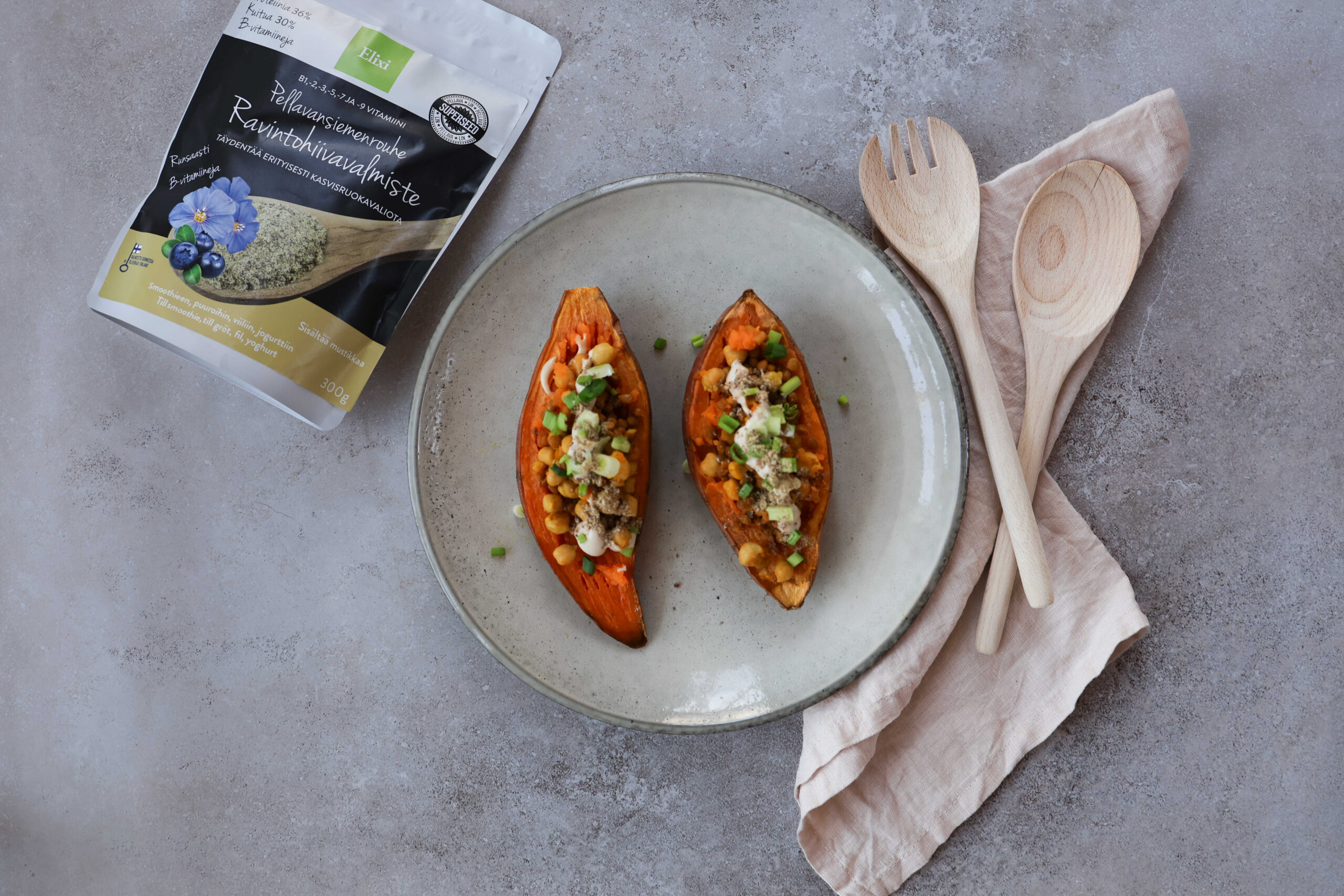 Uunissa paahtunut bataatti muuttuu pehmeäksi ja makeaksi pohjaksi, jonka päälle kasataan mausteinen kikherne-linssitäyte ja täyteläinen tahinikastike. Näissä bataatti-kikherneveneissä yhdistyvät ruokaisuus, ravinteikkuus ja helppous. Tämä on täydellinen kasvisruoka, joka toimii niin arjessa kuin viikonlopun herkutteluhetkissä.