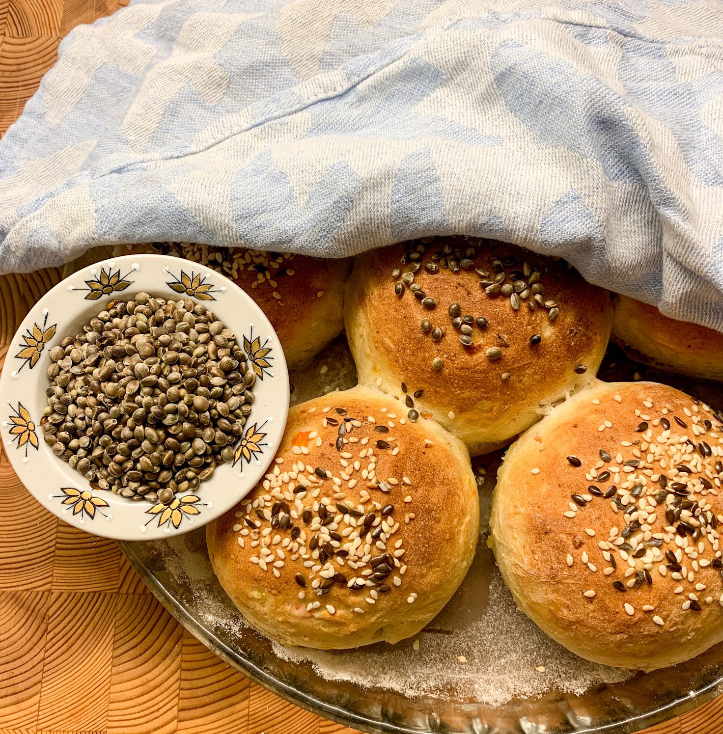 Leivo taikinasta sämpylöitä ja anna niiden kohota pellillä vielä ainakin puoli tuntia. Kohoamisajan päätyttyä sivele pinnalle vähän vettä tai kananmunaa ja ripottele hampunsiemenet.