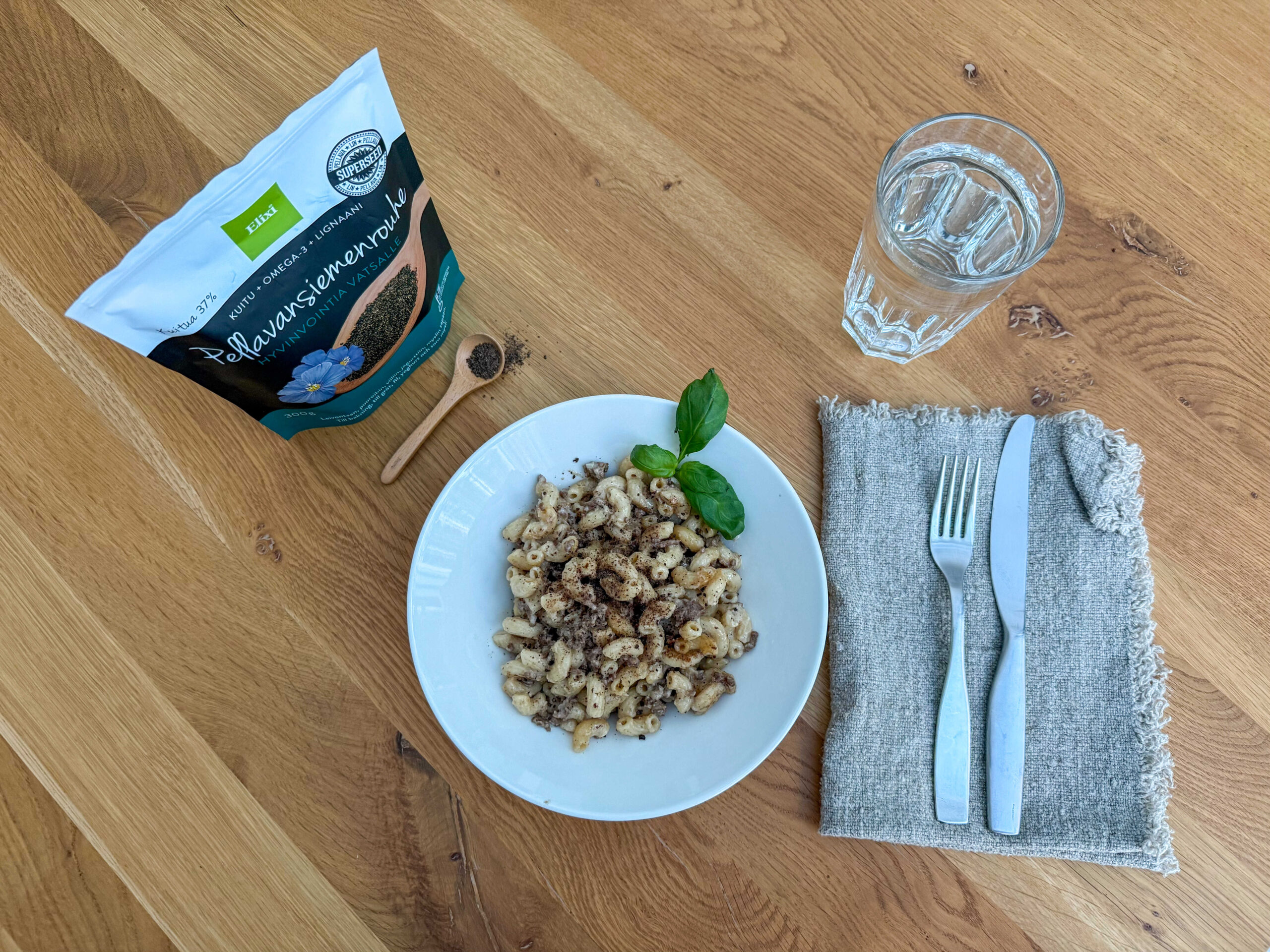 Mausta jauheliha suolalla ja pippurilla, ja lisää joukkoon Elixi Pellavansiemenrouhetta.