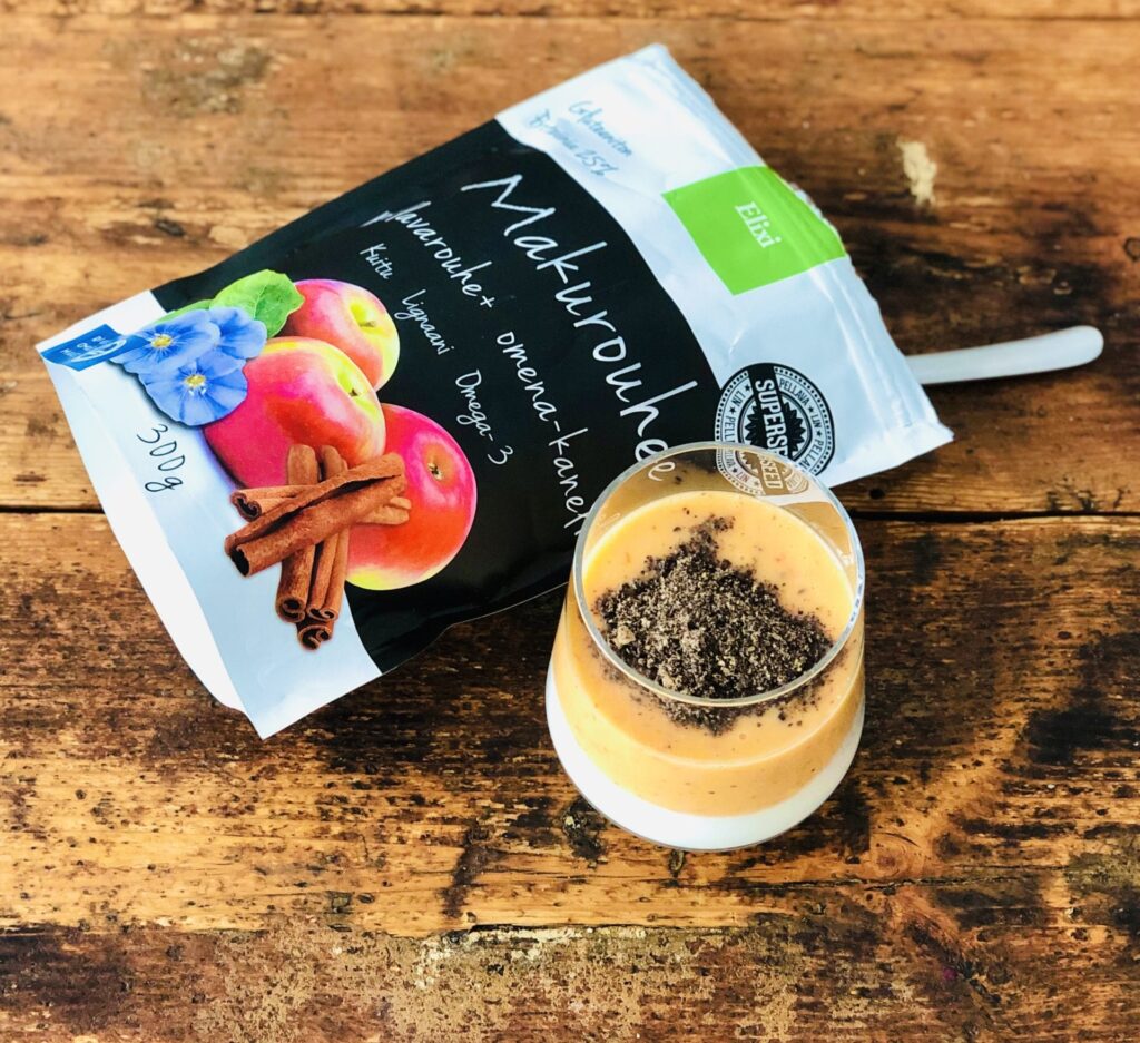 Tarjoa smoothie maustamattoman jogurtin ja Makurouheen kanssa. Makurouheen voi laittaa myös smoothien joukkoon, mutta annoksen päällä tarjoiltuna se tuo annokseen ihanaa rouheutta!